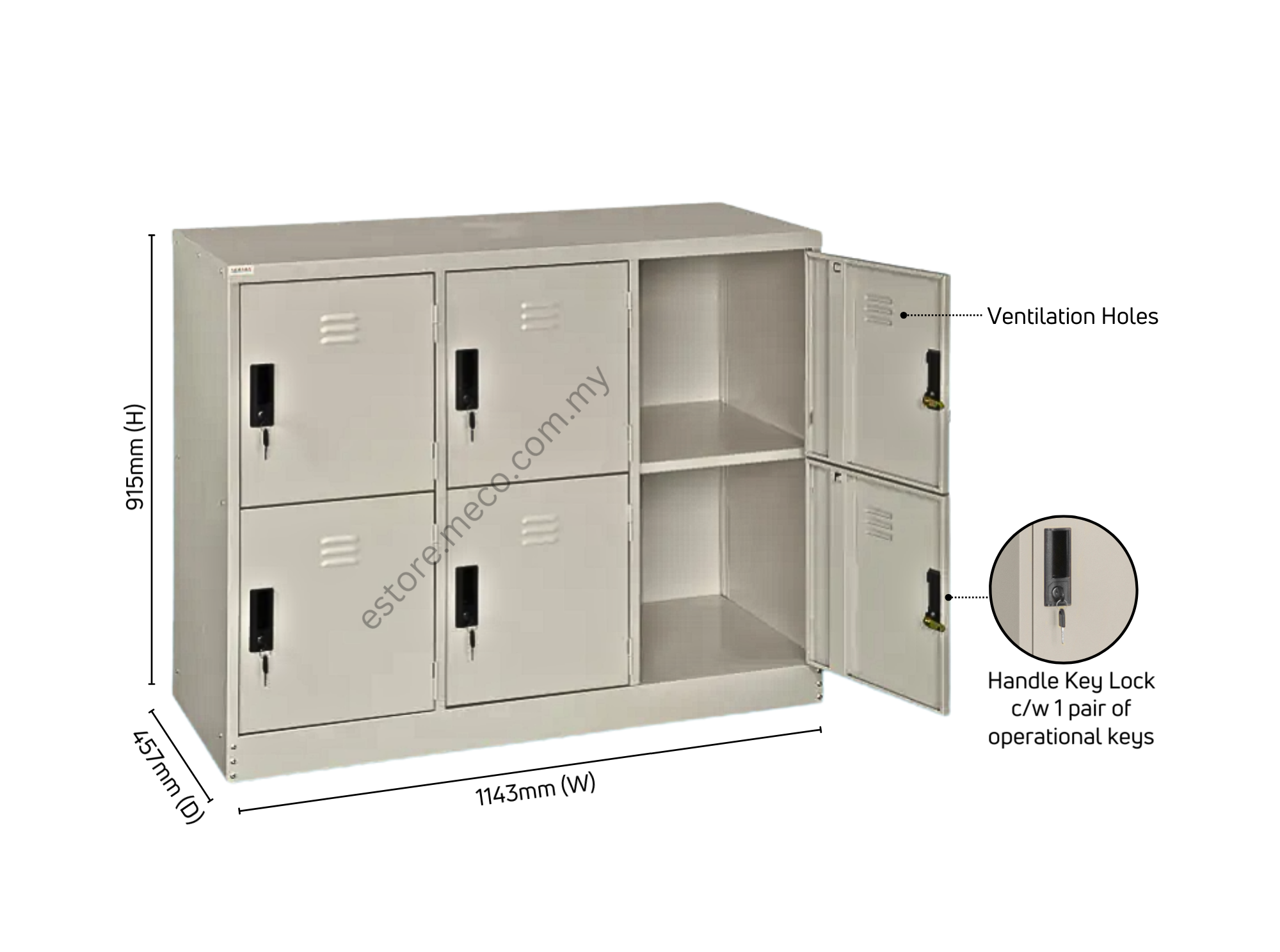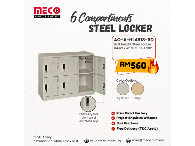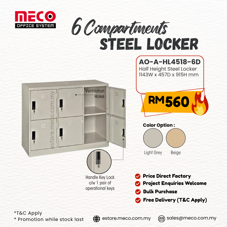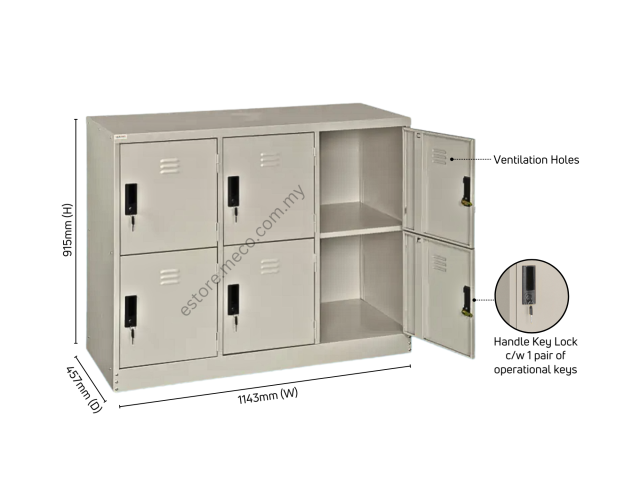Half height 6 door steel locker cabinet. These lockers are durable, sturdy and have ventilation holes for easy air circulation. Moreover these lockers ensure safety which gives peace of mind for user to store personal and valuable items. The door with a plastic handle key lock system and there are 2 secure door hinges & with termite resistant. This unit has been tested for office use and meets the requirements for safety. It`s recommended for factory, hostel, home, colleges, institutes or office use .